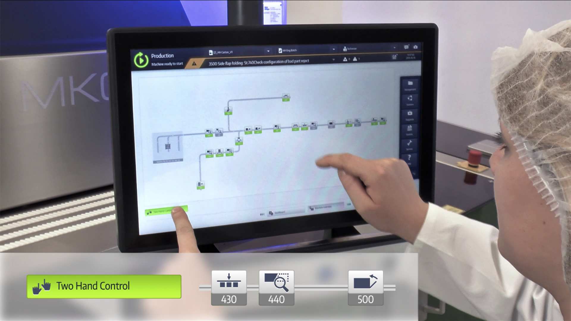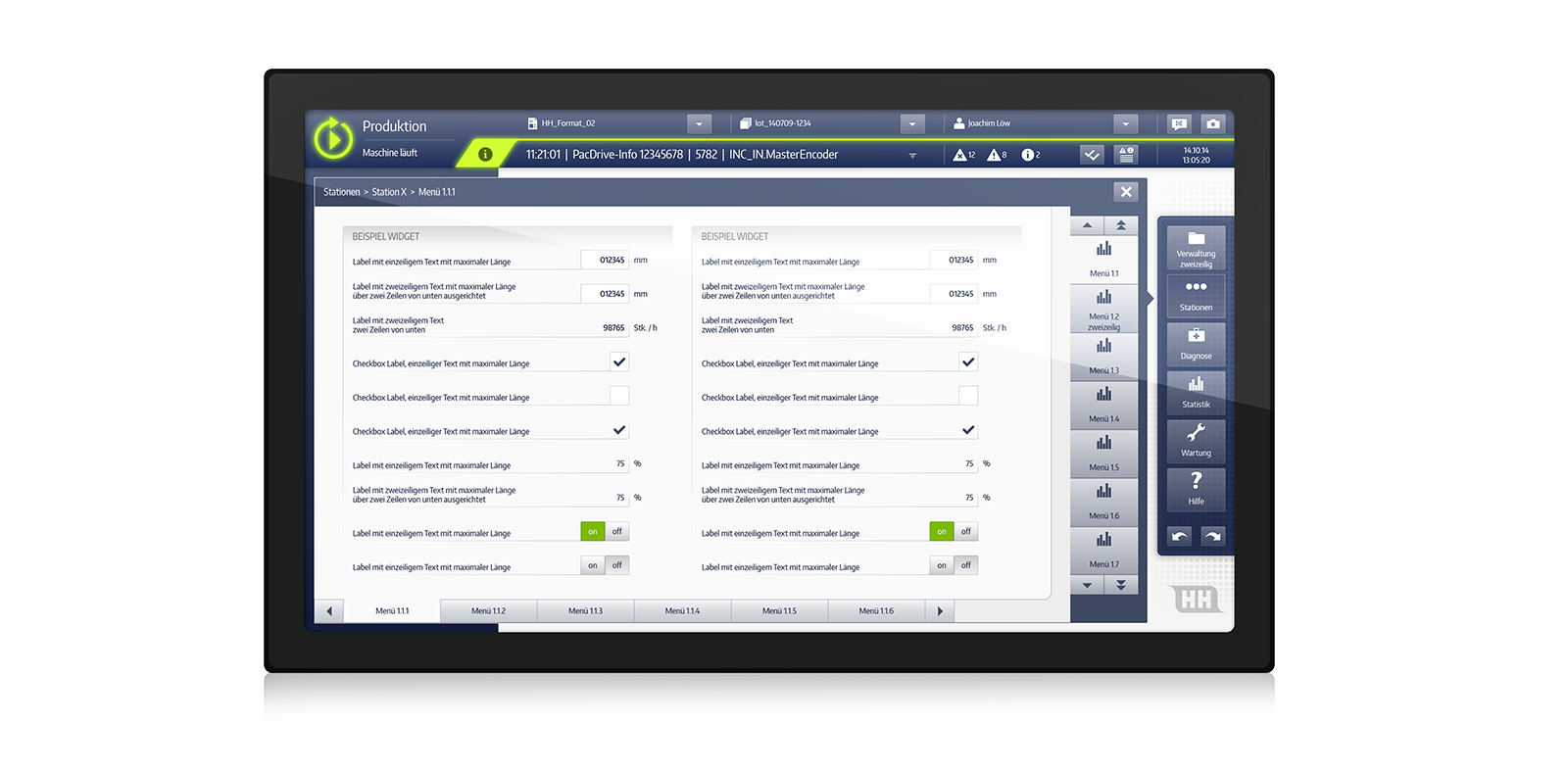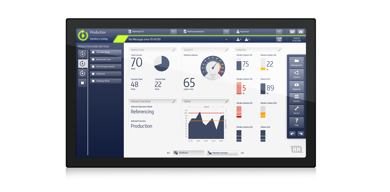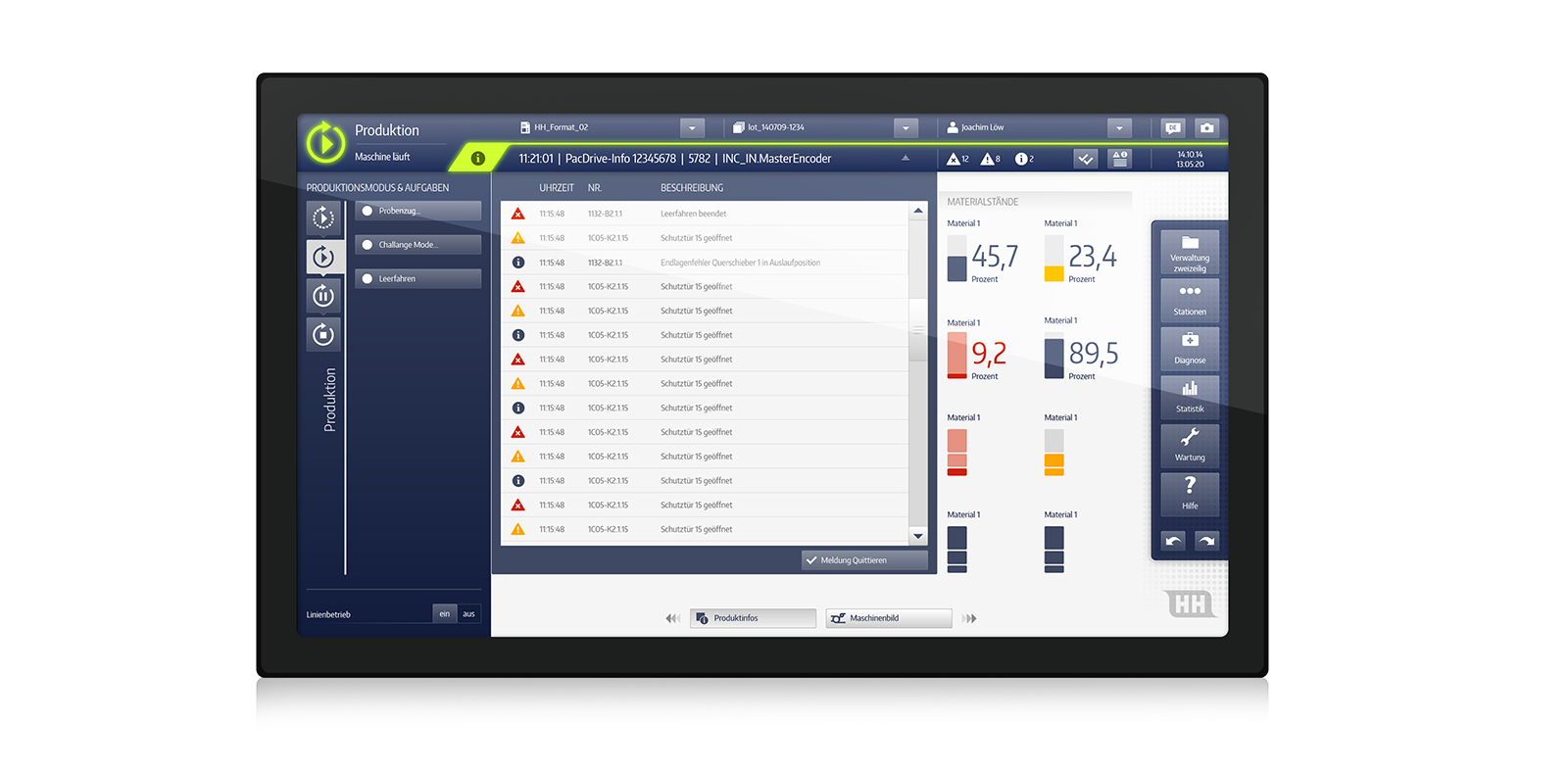 Das multitouchfähige Interface für die verschiedenen pharmazeutischen Verpackungs- und Abfüllmaschinen von Harro Höfliger zeichnet sich durch eine herausragende Orientierung an den untrennbar verzahnten Faktoren Mensch, Aufgabe, Prozess und Maschine aus: Schnelle, individuelle Zugriffe auf alle Parameter, über Widgets personalisierbare Dashboards und anwenderfreundliche Bedien- und Navigations-Strukturen ermöglichen einen hohen Bedienkomfort. Die stets verfügbare Links- bzw. Rechtsumschaltung des Hauptmenüs, der immer präsente Produktions-Screen und schnell erfassbare Visualisierungen sehr komplexer Arbeitsabläufe bilden das Rückgrat einer ergonomisch ausgeklügelten Bedienphilosophie.