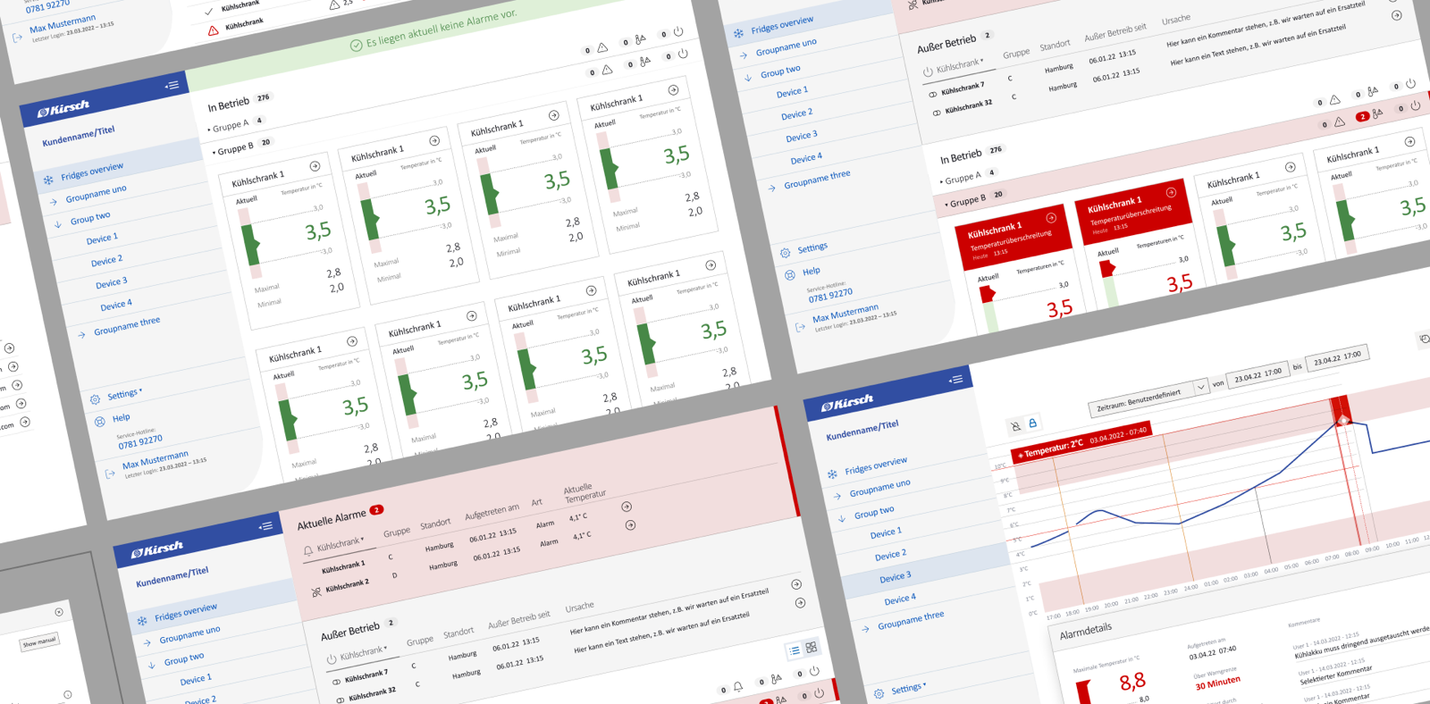 Beim UX/UI Design der Cloud haben wir ein UX Review, ein UX-Konzept für ausgewählte Seiten sowie die Stilfindung und das UI-Design für Kirsch übernommen. Unser Hauptaugenmerk lag auf der Darstellung der Informationen auf dem Dashboard. Diese sind für die Nutzer von entscheidender Bedeutung, da sie zur Sicherheit bei der Echtzeitüberwachung beitragen. Es ist wichtig, dass alle Abweichungen vom Sollzustand unmittelbar erkannt werden. Die Navigation wurde so gestaltet, dass sie unterschiedliche Nutzertypen unterstützt, darunter Beobachter und Experten/Einrichter.