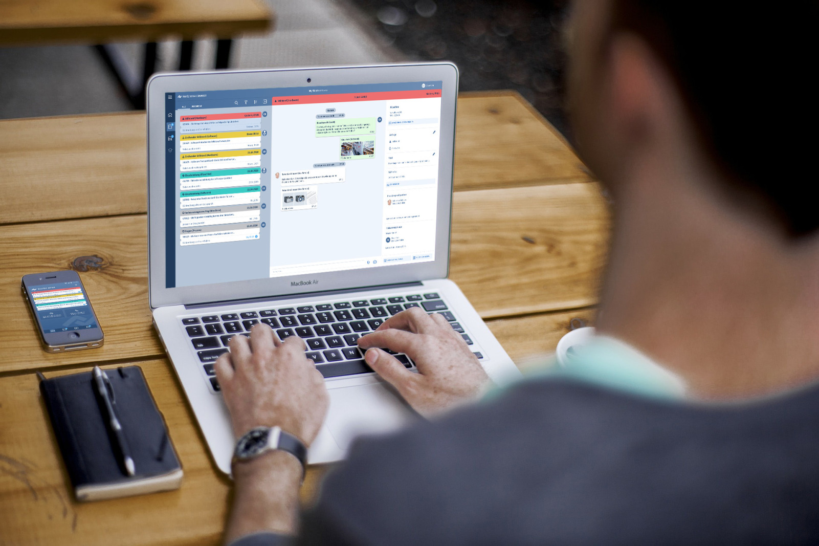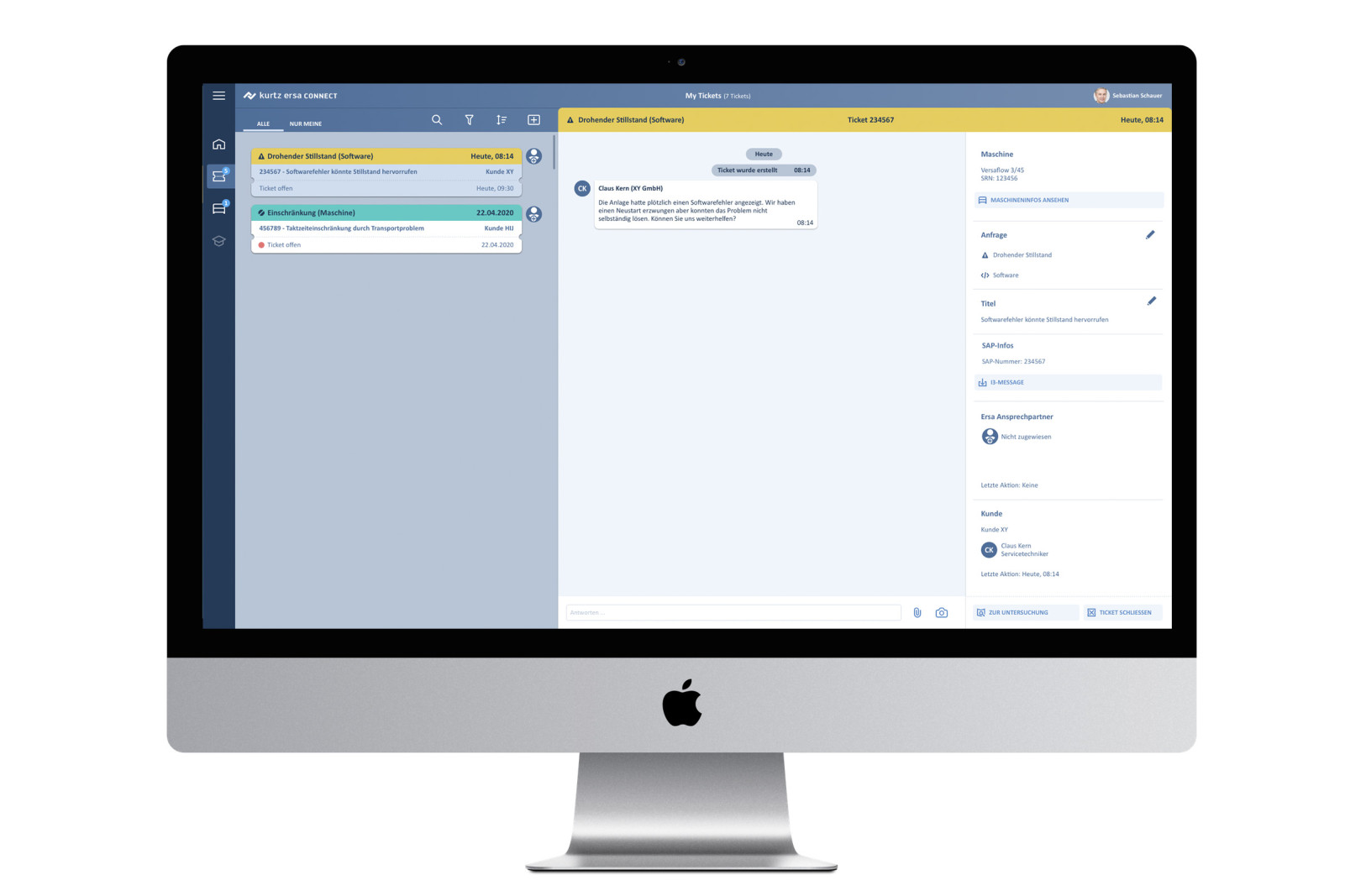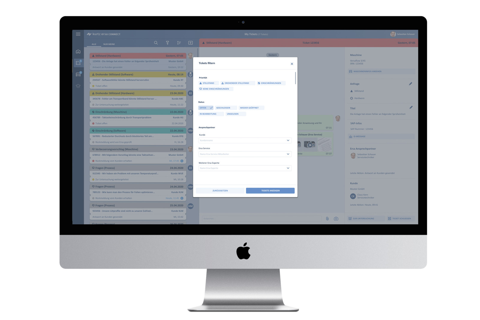 Das Ticketsystem für Service- und SupportAnfragen ermöglicht eine Realtime Diagnose und unterstützt eine eigenständige, zeitnahe Fehlerbehebung. Für die Konzeption und Gestaltung dieser Funktionalität haben wir etablierter Muster aus der privaten Kommunikation herangezogen. Via Chat-Ansicht wird der Dialog zwischen Kunden und Ersa übersichtlich und intuitiv. Zudem haben wir auf die Übersichtlichkeit der Visualisierung und Verschlagwortung der Tickets besonderen Wert gelegt. Dadurch wird eine schnelle Priorisierung der Anfragen möglich. Sowohl der Kunde als auch der Servicemitarbeiter müssen auf den ersten Blick erkennen, welches Ticket sie zuerst übernehmen sollen und was als nächstes zu tun ist. Bedienlogiken, die man aus dem Privatleben gelernt hat, wenn man z. B. Bordkarten in einer App verwaltet oder mit Notifications umgeht, kommen auch hier zum Einsatz.