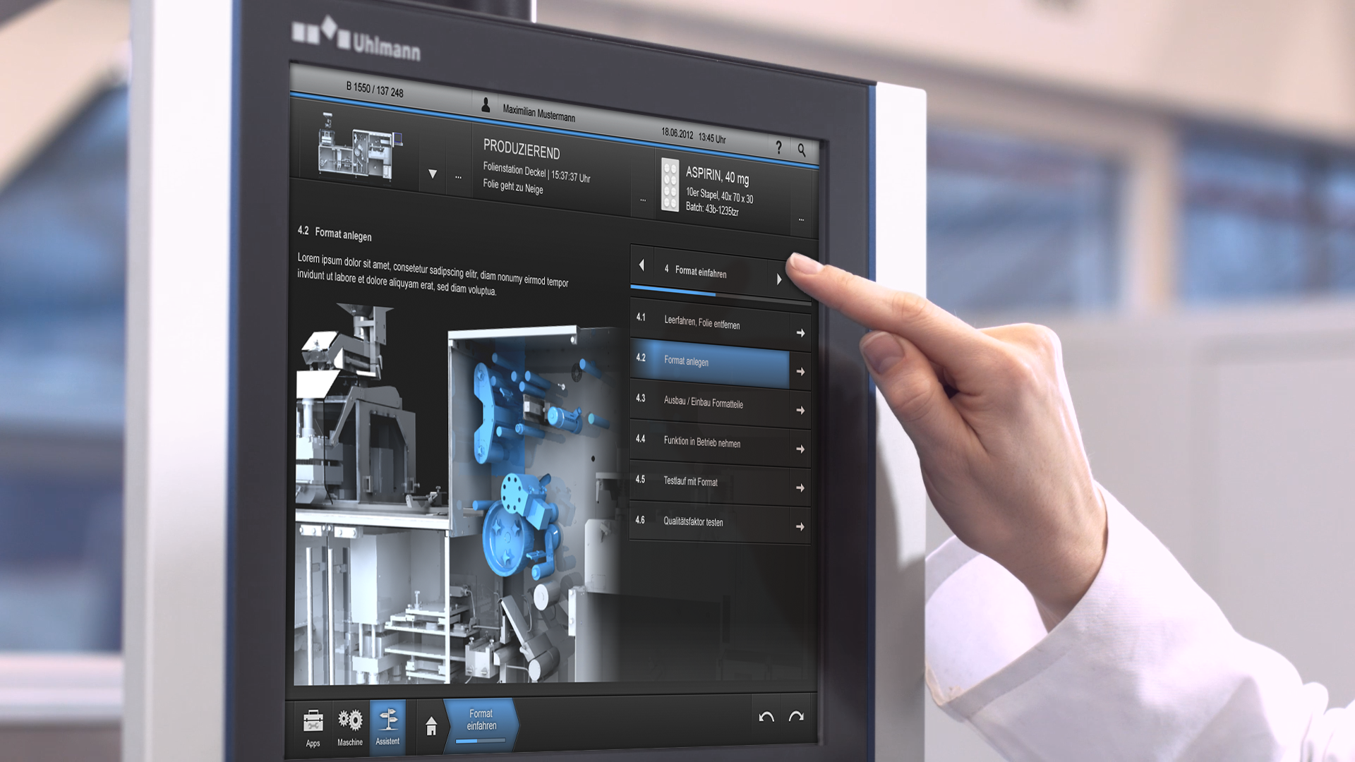 Das SmartControl Panel der Firma Uhlmann ist für sein Hard- und Software Design mehrfach prämiert worden. Das Bedienpanel für pharmazeutische Verpackungsmaschinen wurde sowohl in puncto User Interface und User Experience Design als auch Industrial Design gestaltet. Dieser Ansatz sorgt für einen Gleichklang aus Hard- und Software. Die gemeinsame Grundphilosophie: Verbindung von Hightech-Aspekten mit komplexitäts-reduzierender, anwenderfreundlicher Bedienung. Das Panel ist drehbar und der vorstehende Griff dient sowohl als Schutz als auch als Ablagefläche. Mögliche Schnittstellen für Peripheriegeräte befinden sich dezent im Rückwandsockel. Dabei erfüllt das Bedienpanel höchste Hygieneanforderungen.
