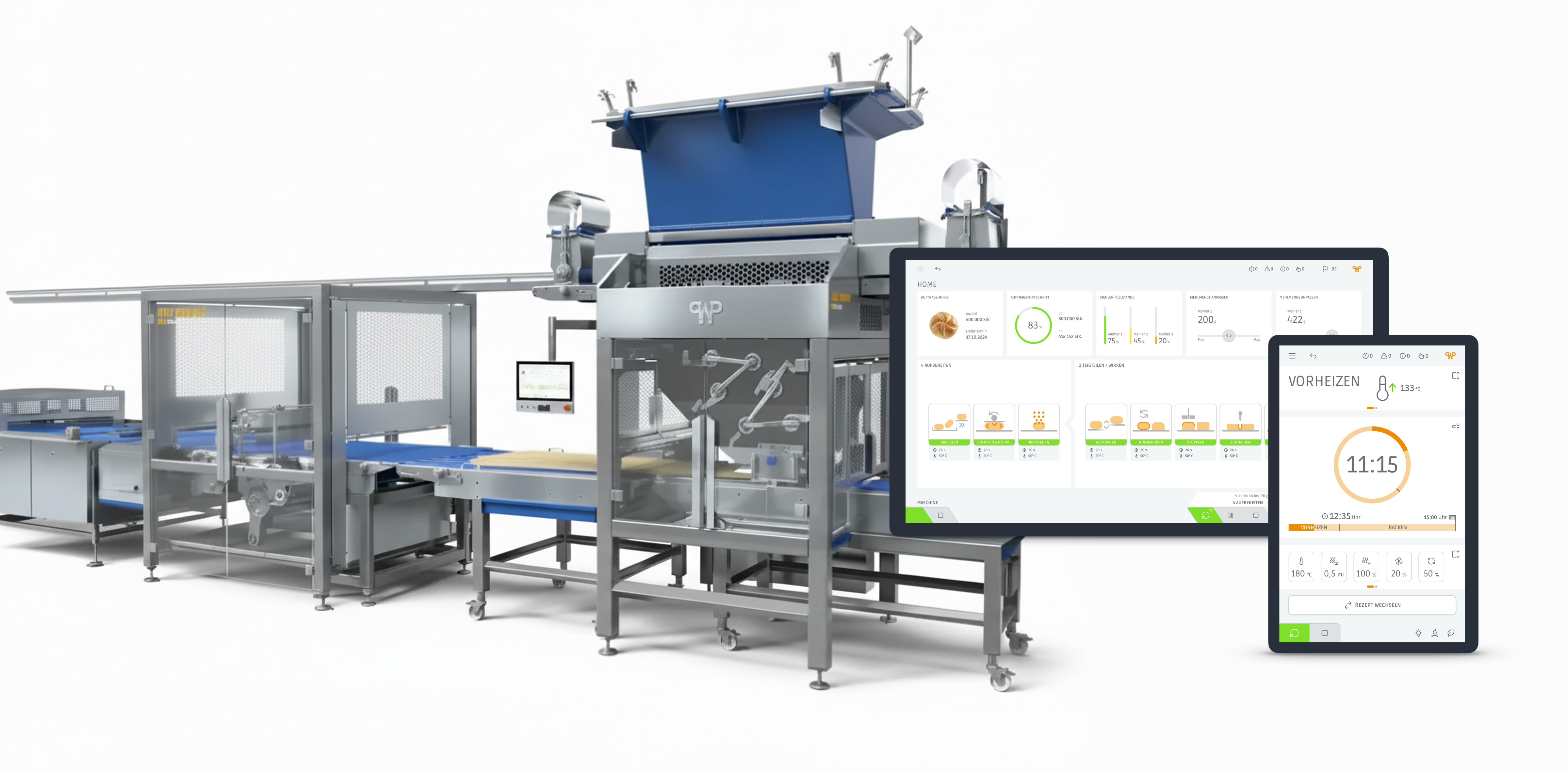 Das neue HMI basiert auf einem klar strukturierten, responsiven UX/UI-Konzept auf Web-Technologie-Basis. Es skaliert von Full-HD-Landscape-Displays großer Anlagen bis zu Portrait-Displays kleinerer Backöfen wie dem Rototherm – mit durchgängiger Bedienlogik über alle Maschinen hinweg.